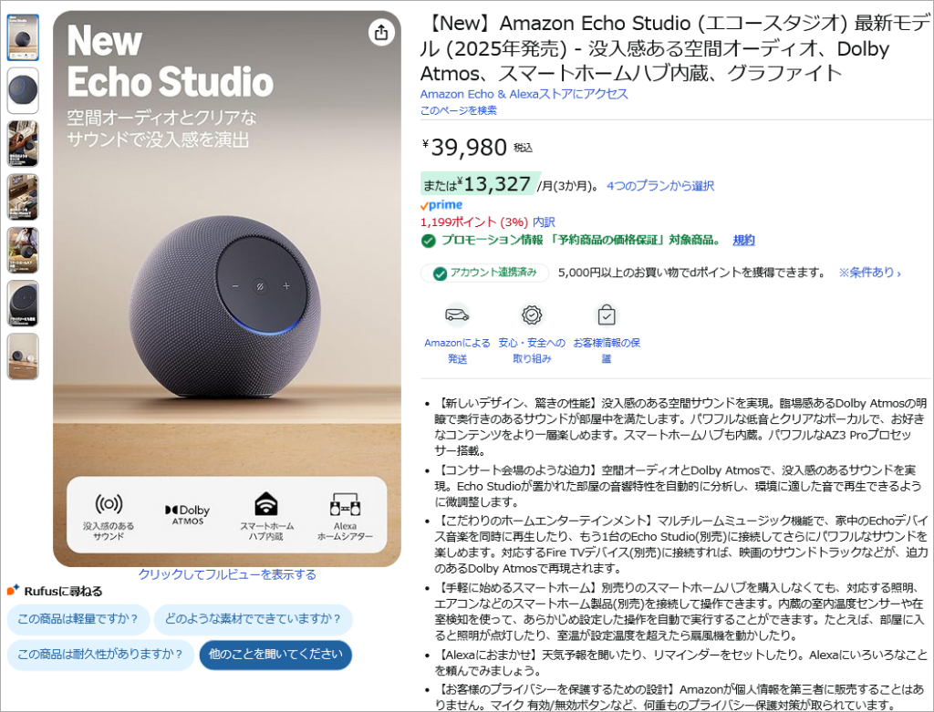 価格は前Echo Studio(29,980円)の1万円高の39,980円です!!