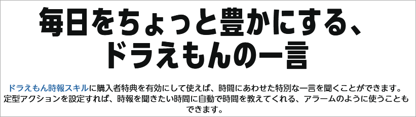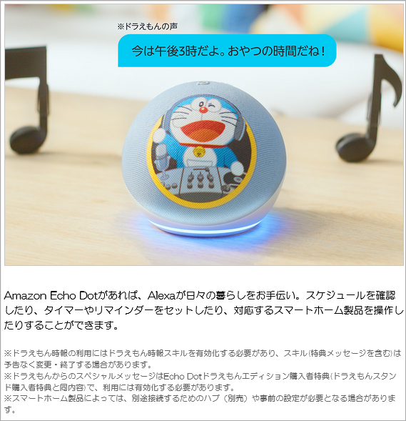 ※ドラえもんからのスペシャルメッセージはEcho Dotドラえもんエディション購入者特典(ドラえもんスタンド購入者特典と同内容)で、利用には有効化する必要があります。