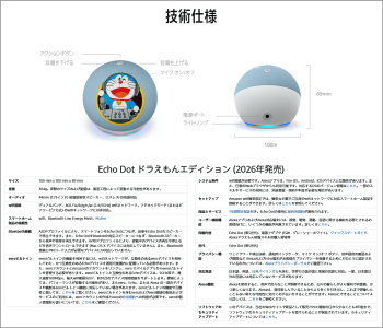 ・・・最後に、基本的にEcho Dotと同じですが、技術仕様を貼らせていただきます。